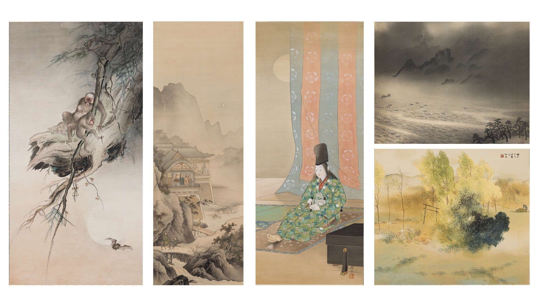 左から:横山大観(秀麿)「猿図」、橋本雅邦「春秋楼閣山水図(左)」、寺崎廣業「敦盛吹笛図」、横山大観(秀麿)「漁火」、竹内栖鳳「水郷」